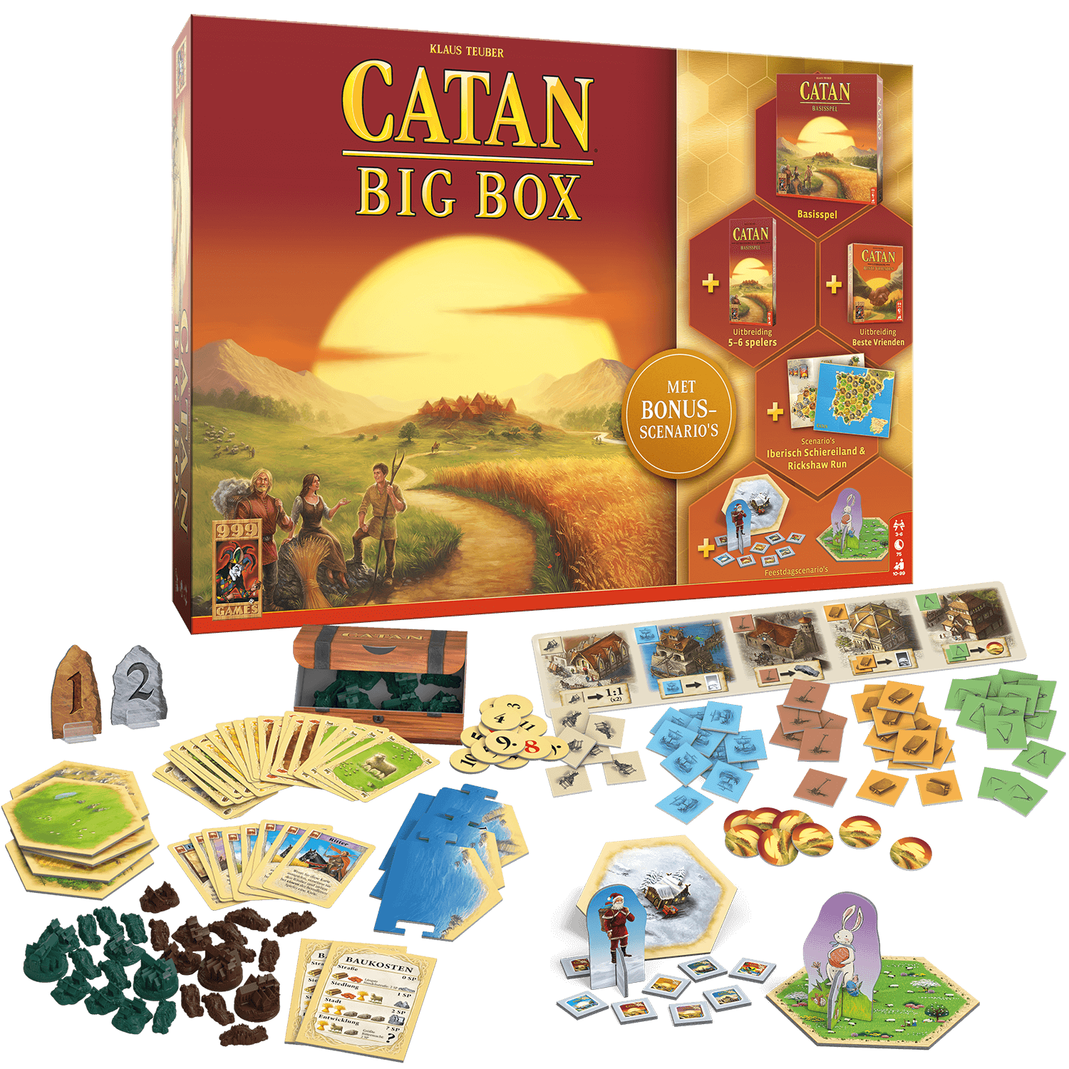 Het basisspel, de uitbreiding voor 5 en 6 spelers en 5 avontuurlijke scenario’s in 1 doos!