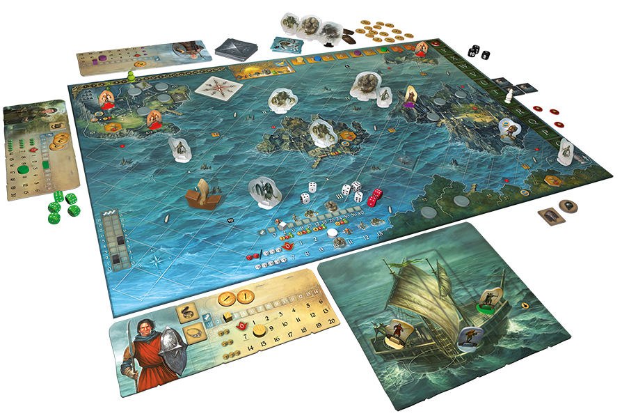 Zeil met een aftands schip naar het noorden en beleef in 4 nieuwe legenden fantastische coöperatieve avonturen. De Reis naar het Noorden bevat een dubbelzijdig speelbord en veel nieuw speelmateriaal, waaronder nieuwe monsters en zelfs een nieuwe held: de zeekrijger! Je kunt De Reis naar het Noorden uitsluitend in combinatie met het basisspel te spelen. Heb je ook de uitbreiding "Nieuwe Helden", dan kun je deze uitbreiding ook met 5 of 6 helden spelen.