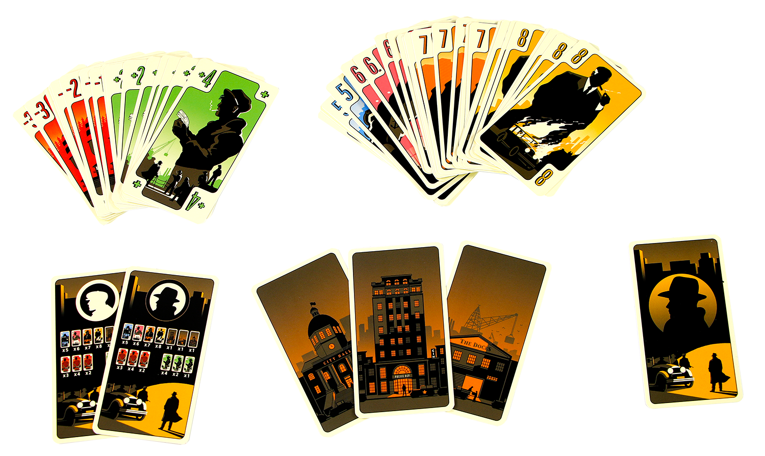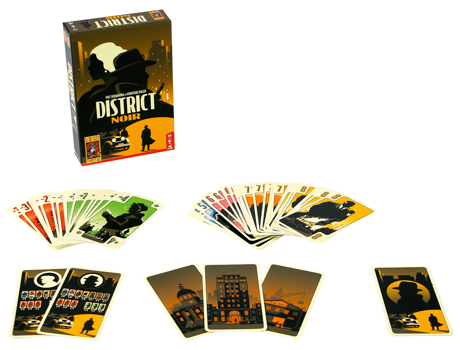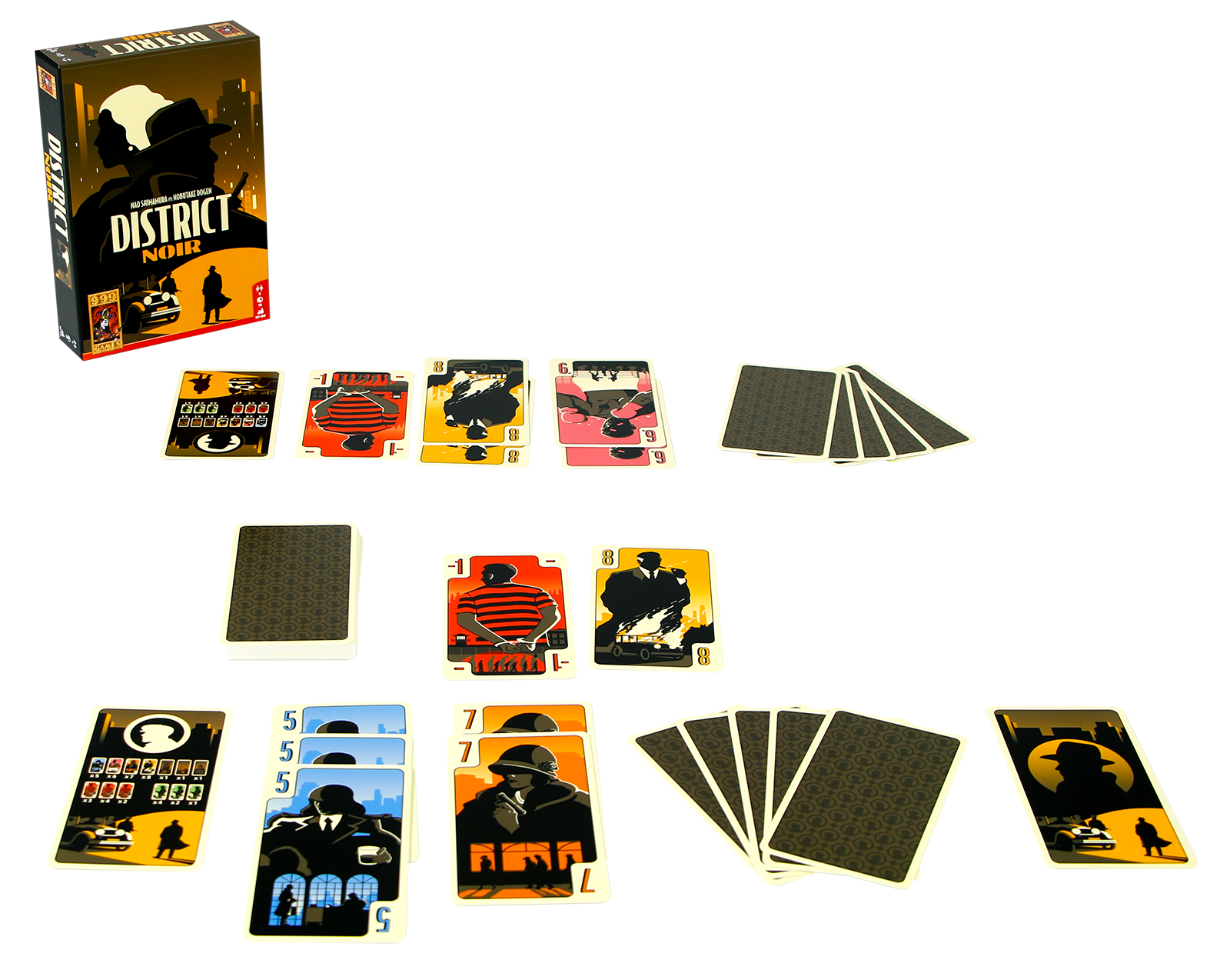 De twee spelers zijn machtige leiders van de grootste criminele organisaties in de stad en strijden om gebieden en steun, waarbij ze geen middel schuwen om hun invloed uit te breiden. In het centrum van Hoboken ligt District Noir. De controle over die wijk maakt het grote verschil om de macht over de hele stad te grijpen. De spelregels van dit tactische kaartspel voor 2 spelers zijn heel eenvoudig. Beide spelers krijgen 5 kaarten. Wie aan de beurt is, legt een handkaart in de rij of neemt de laatste 5 kaarten die in de rij zijn gelegd. De andere speler heeft steeds dezelfde keuze. Maar, het nemen van 5 kaarten mag maar één keer per ronde. Daarna moet de speler dus steeds een kaart in de rij leggen. Aan het einde krijgen de spelers punten als ze de meeste kaarten van een bepaalde soort hebben en voor complete setjes van verschillende soorten. Verder zijn er kaarten die direct plus- of minpunten geven. Slaagt een speler erin om alle 3 strategische locaties in zijn bezit te krijgen, dan wint hij direct. Wie grijpt de macht in de stad? District Noir is een zeer toegankelijk kaartspel voor 2 spelers. De eenvoudige spelregels zorgen ervoor dat de spelers snel aan het spelen zijn, maar ze zullen er spoedig achterkomen dat de keuzes die ze tijdens het spel moeten maken een stuk minder makkelijk zijn!
