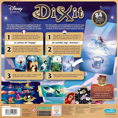 Dixit Disney is een eenvoudig en luchtig bordspel van verhalen vertellen, interpretatie en giswerk. Spelers worden uitgedaagd en blij als ze een reeks kaarten met prachtige Disney-thema's onthullen. Zoek de link bij een raadselachtige omschrijving voor een van de onthulde kaarten, vind de juiste afbeelding en scoor punten. Met 84 nieuwe kaarten gebaseerd op iconische Disney & Pixar films, van Steamboat Willie tot Turning Red, zal Dixit Disney spelers boeien.