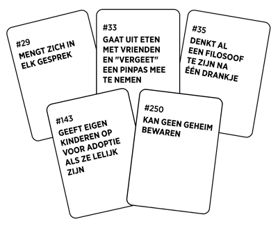 Verzamel vier of meer van je vrienden en bereid je voor op een spelletje vol schaamte. Neem een kaart en kies de speler die zich waarschijnlijk zo belachelijk zal gedragen als beschreven. Dit wordt lachen.
