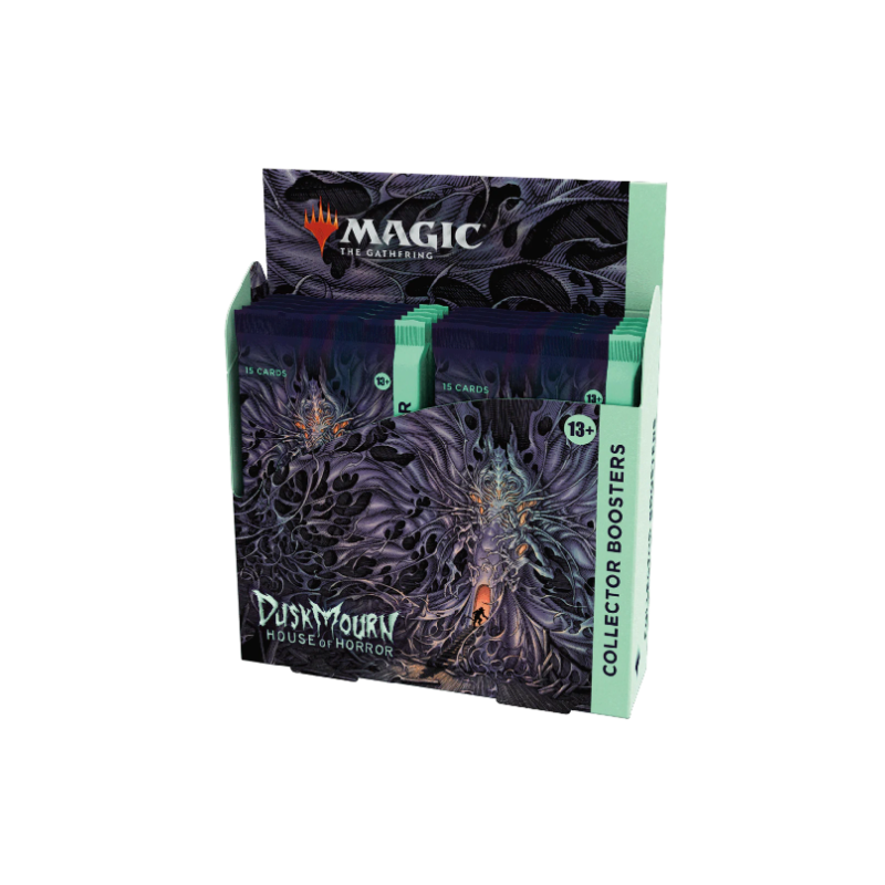 Een verzamelbooster van Duskmourn: House of Horror bevat altijd vijf rares, een full-art basislandkaart, 12 tot 13 foil kaarten en verschillende showcase- of uitgebreide kunstkaarten. Alternatieve lijsten zijn showcase-, randloze, speciale gast- of uitgebreide kunst. In 9% van de Collector Boosters vind je een Japanse showcasekaart en in 1% van de boosters een Fractured Foil Japanse showcasekaart.