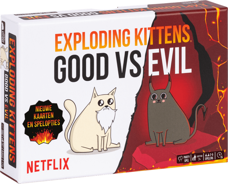Dit is de meest riskante versie van Exploding Kittens! Speel een episch duel tussen goed en kwaad met de gloednieuwe Armageddonkaarten!