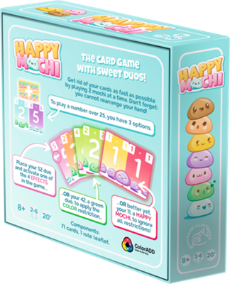 Het kaartspel met de schattigsche duo’s! Raak je kaarten zo snel mogelijk kwijt door 2 mochi’s tegelijkertijd te spelen. Maar let op! Je mag je kaarten niet herschikken in je hand! Je moet altijd een duo van mochi’s spelen die hoger of lager zijn dan het duo dat op de tafel ligt (afhankelijk van de + of - kaart). Als dat niet lukt, neem je een open of gedekte mochi van de tafel en voeg je die op een strategishe plek toe aan je mochi handkaarten. Je wint het spel als je als eerste al je mochi’s kan kwijtspelen, maar dat klinkt eenvoudiger als het is. Je tegenspelers hebben misschien wel mochi’s met speciale eigenschappen waardoor het spel opeens een andere richting opgaat!
