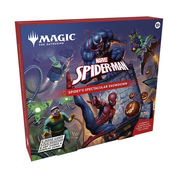Deze scene box bevat zes gloednieuwe Magic: the Gathering speelkaarten voorzien van prachtige art, zes art cards met dezelfde art maar zonder tekst en een speciale etalage om je kaarten op tentoon te stellen. De scene box bevat bovendien drie play boosters van Marvel's Spider-Man om aan je verzameling toe te voegen.