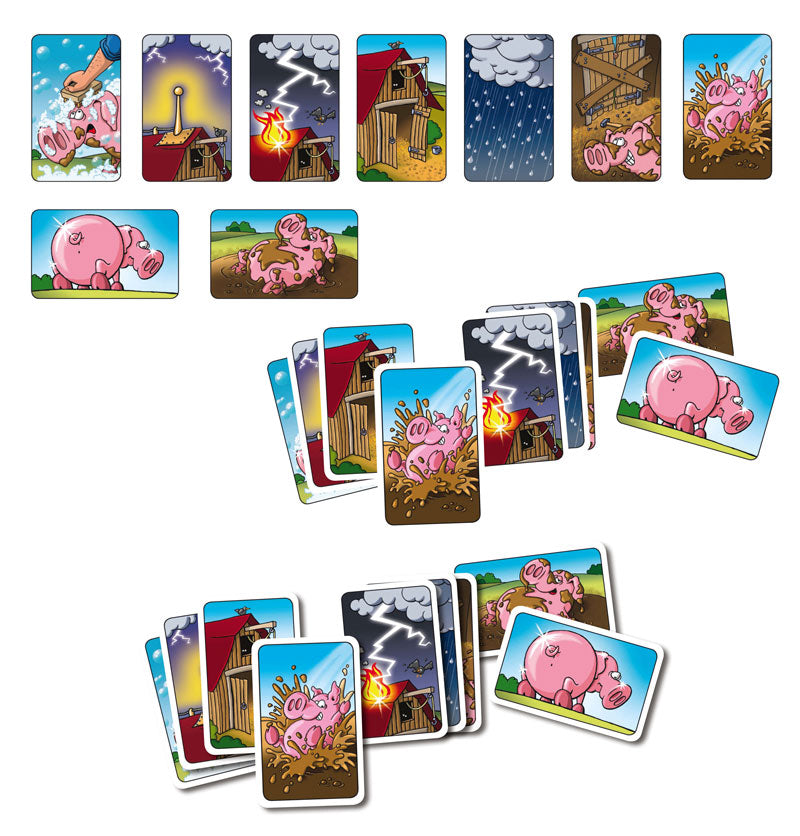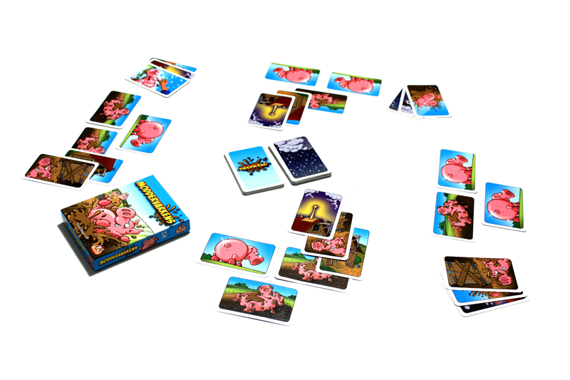 In ‘Moddervarkens’ probeert iedere speler zijn varkens te laten spelen in de modder om ze lekker vies te maken. Maar pas op, want je tegenstanders zullen alles in het werk stellen om jouw varkens weer schoon te wassen. Een stal komt dus goed van pas, want een dak biedt sowieso bescherming tegen regenkaarten. En als je de deur dan ook nog eens dicht laat timmeren, dan kan geen boer binnenkomen om jouw varkens schoon te boenen. De speler die uiteindelijk alleen maar moddervarkens voor zich op tafel heeft liggen, wint het spel! Dus ga dat varkentje van je tegenstanders maar eens wassen!