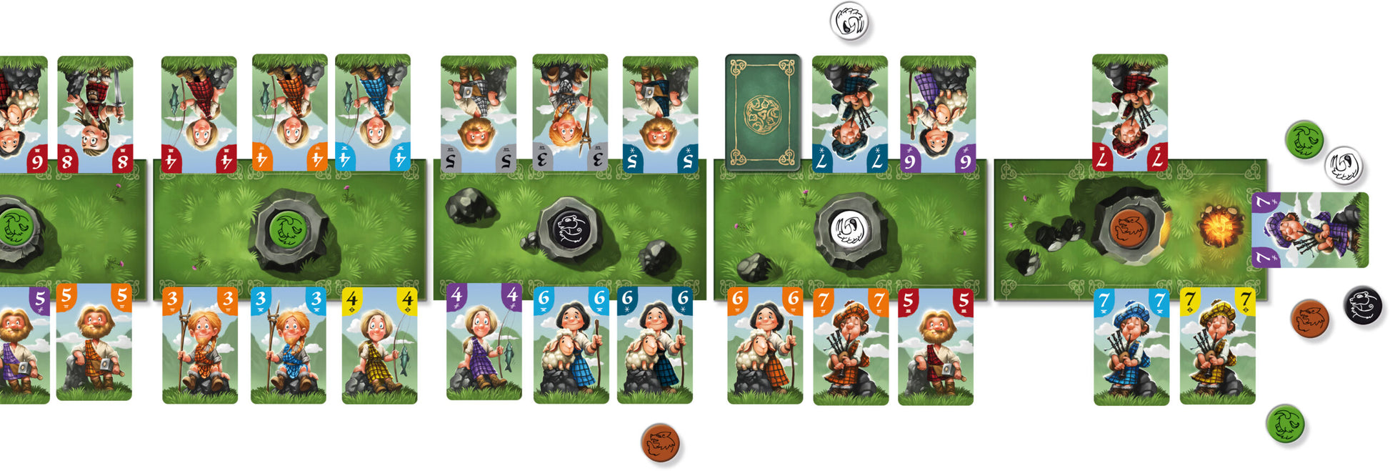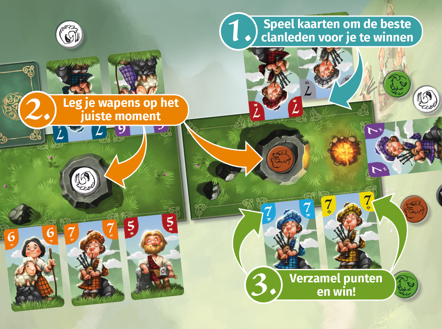 In Sluwe Schotten ben je een clanhoofd die zoveel mogelijk nieuwe leden probeert te rekruteren door slim kaarten te leggen. Nieuwe clanleden leveren punten op en de speler met de meeste punten wint het spel. Als je aan de beurt bent, moet je altijd 1 kaart toevoegen aan een ontmoetingsplaats. Daarnaast kun je ook besluiten om 1 van je schilden op een schildveld te leggen om de gunst van potentiële clanleden te ontvangen. Kies slim; wat is het beste moment om een schild te leggen? Hoe kun je alles met 1 kaart in je voordeel ombuigen?