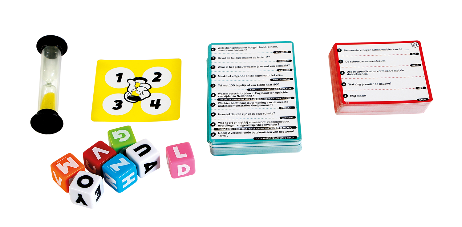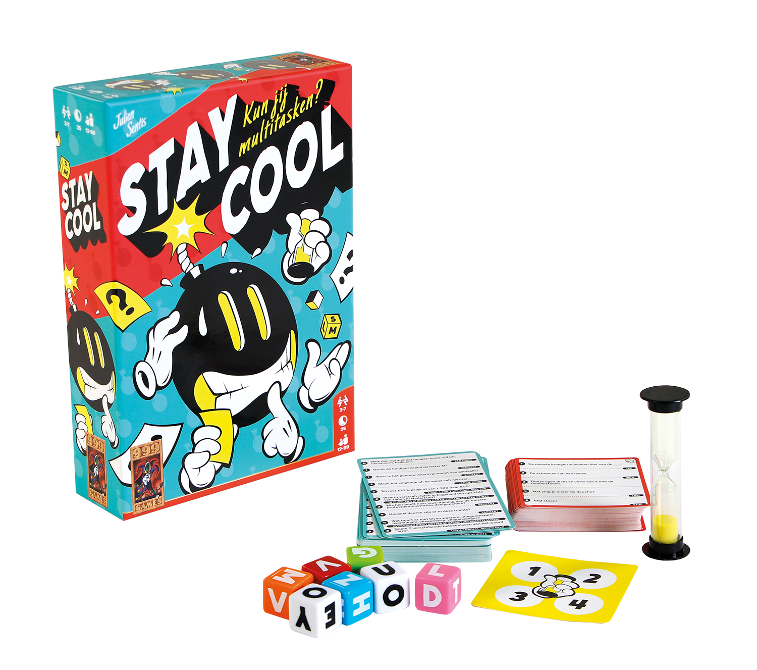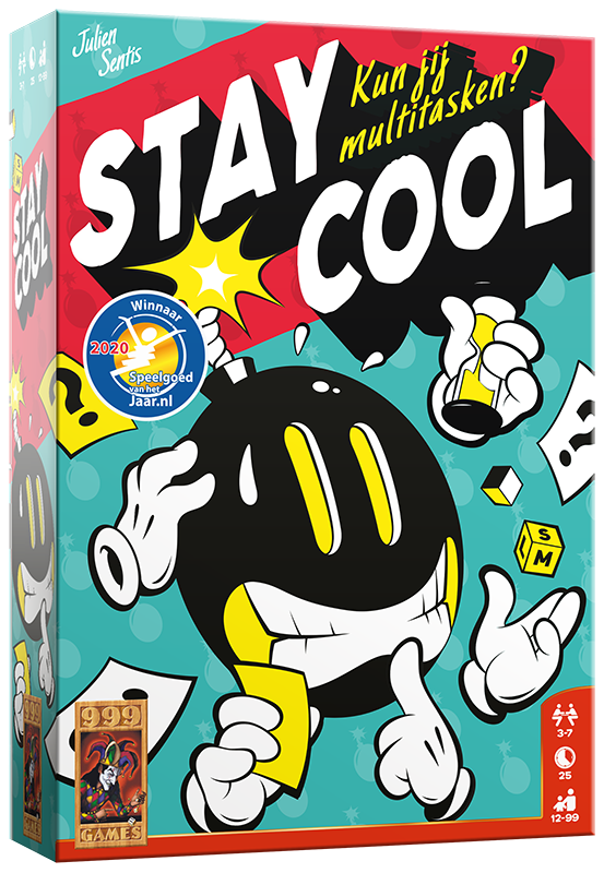In Stay Cool word je door je medespelers gebombardeerd met vragen en de speler die de meeste vragen weet te beantwoorden, wint. Het zijn absoluut geen moeilijke vragen die diepgaande kennis vereisen. Zo zitten er alledaagse vragen, persoonlijke vragen, maar ook behendigheids- of snelheidsopdrachten tussen. Ben je een beetje scherpzinnig of vindingrijk, dan zal het geen probleem voor je zijn om de vragen snel te kunnen beantwoorden. Natuurlijk loopt er een timer, maar verder niets om je zorgen over te maken, of wel? De uitdaging van het spel is dat twee mensen je vragen stellen, tegelijkertijd! Daarnaast moet je ze ook op twee verschillende manieren beantwoorden. Beantwoord de vraag van je linkerbuurman hardop, terwijl je het antwoord op de vraag van je rechterbuurman ‘opschrijft’ door dobbelstenen met de letters erop te spellen. Terwijl je dit doet, zet een andere speler vier keer een zandloper van 30 seconden, waardoor je in totaal twee minuten hebt om zoveel mogelijk vragen te beantwoorden. Aan het einde van die tijd vermenigvuldig je het aantal correcte antwoorden dat je op de vragen van links en rechts hebt gegeven met elkaar om je score te bepalen. De winnaar is degene die in 3 rondes de meeste vragen correct heeft beantwoord en zo de meeste punten heeft gescoord.
