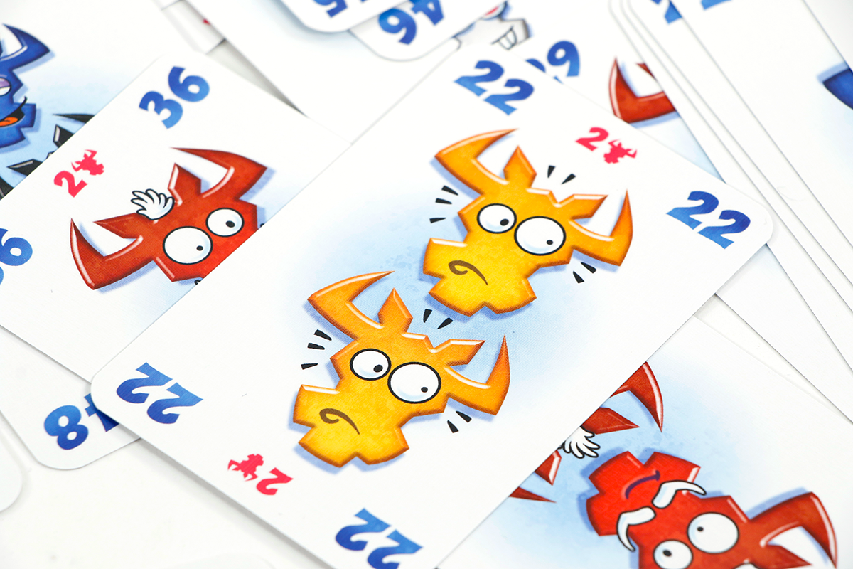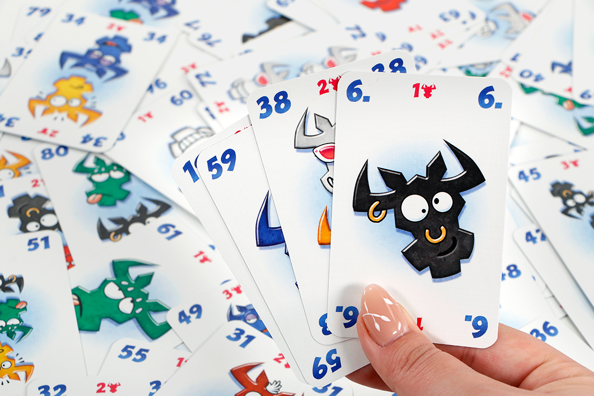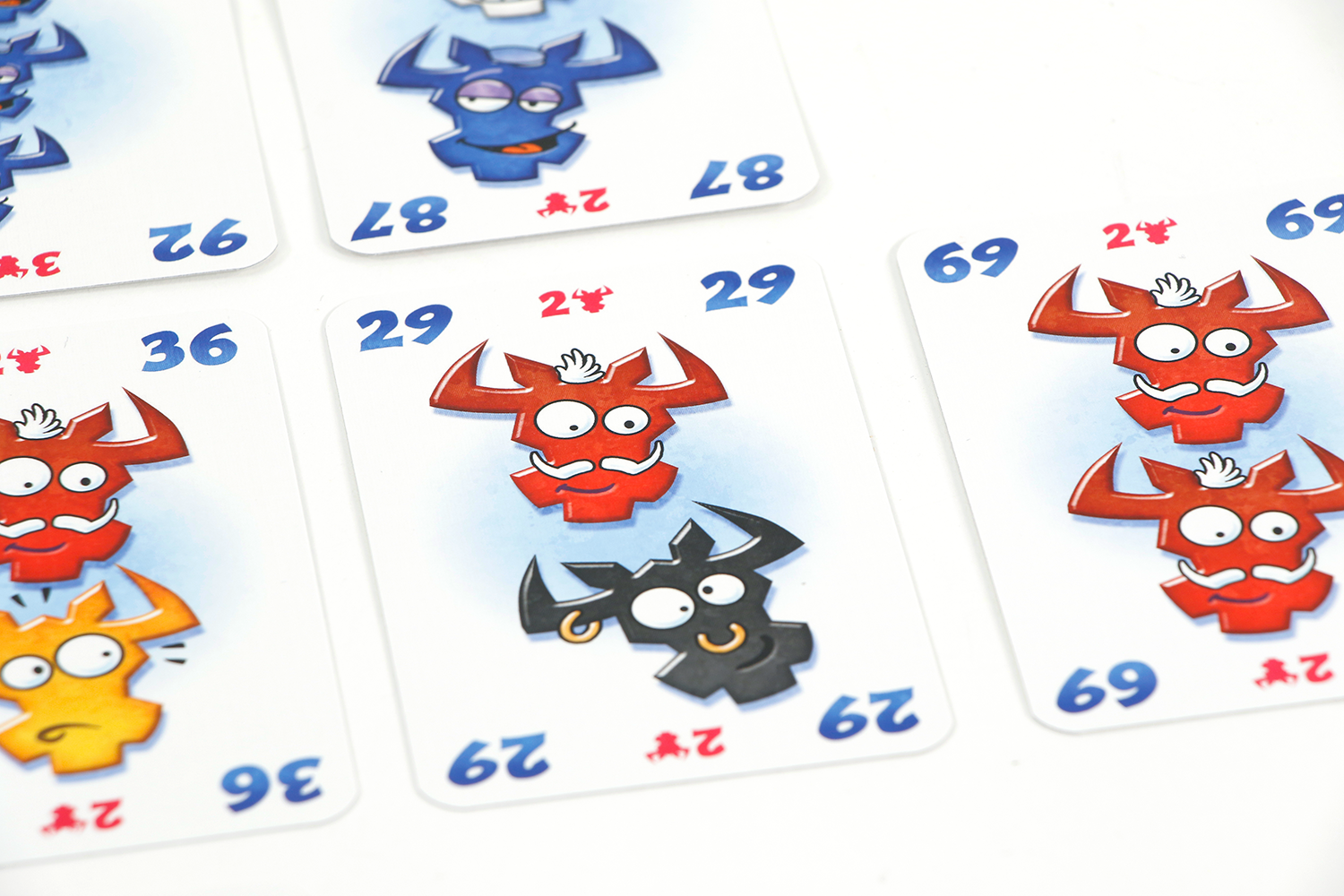 Speel kaarten met koeienkoppen uit je hand om rijen te vormen. Leg ze wel handig aan, want als jouw rij teveel koppen van dezelfde kleur bevat moet je de hele rij kaarten pakken. Aan het einde van de ronde is elke kaart minpunten waard. Worden de rijen langer en de keuzes lastiger, schakel dan de hulp van de Bonte Baron in; deze past overal! Zes is teveel in zowel kleur als aantal in deze bonte variant van Take 5!