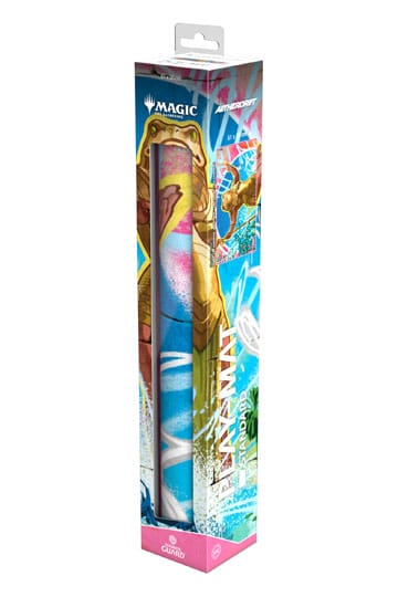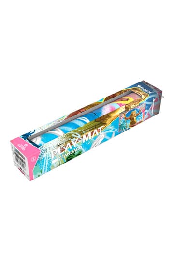 The Play-Mat in the standard size 61x35cm shows officially licensed artworks from Magic: The Gathering's set Aetherdrift. The soft cushioned Play-Mat with non-slip underside improves the gaming experience, protects gaming cards and accessories, and is even more durable than classic Play-Mats thanks to its stitched edges.