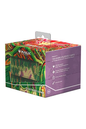 The Sidewinder 100+, made of durable Xenoskin material, holds up to 100 (double-sleeved) or 120 (single-sleeved) cards and is the perfect deck box for Commander/EDH decks. Printed in full color with officially licensed artworks from Magic: The Gathering's Aetherdrift, Ultimate Guard's Sidewinder deck boxes with their strong magnetic closure and quality microfiber inner lining are a safe and reliable storage place for MTG decks and individual trading cards.