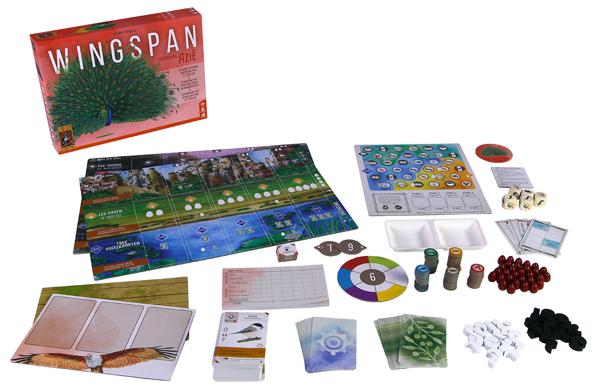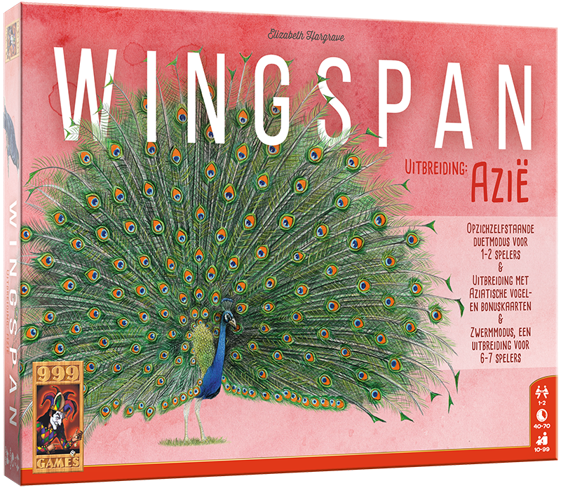 In dit nieuwe deel van Wingspan gaan we op zoek naar nieuwe vogels op het Aziatische continent. 90 nieuwe vogelsoorten maken hun opwachting, samen met nieuwe bonuskaarten en andere extra’s. Zet vogels in je persoonlijke natuurgebieden uit en scoor punten door ze zo goed mogelijk te laten samenwerken. Deze versie van Wingspan kan met twee spelers worden gespeeld. Het spel bevat regels voor de nieuwe “duet”-variant. In deze variant scoor je extra punten met behulp van een tableau met vogeleigenschappen. Zodra je een vogel speelt, dek je de bijhorende eigenschap op het tableau af voor bonuspunten. Dit zorgt voor een uitdagend spel voor twee, vol tactische keuzes. Maar Wingspan: Azië kan ook als uitbreiding op het basisspel worden gespeeld. Sterker nog, met het extra speelmateriaal kan een extra groot spel met maar liefst 7 spelers worden gespeeld! Hierbij wordt gebruik gemaakt van de “zwerm”-variant. In deze spelvariant zijn voortdurend twee spelers tegelijkertijd aan de beurt en wordt de spelersgroep in tweeën verdeeld. Elke groep heeft een eigen vogelhuisje en een eigen kaartenvoorraad, maar beide groepen spelen wel gezamenlijk met dezelfde doeltegels. Dus of je nu een nieuwe ervaring voor twee spelers wilt proberen of er juist een groot vogelfeest voor met zijn zevenen van wilt maken, voor Wingspan-fans is deze uitbreiding een must!
