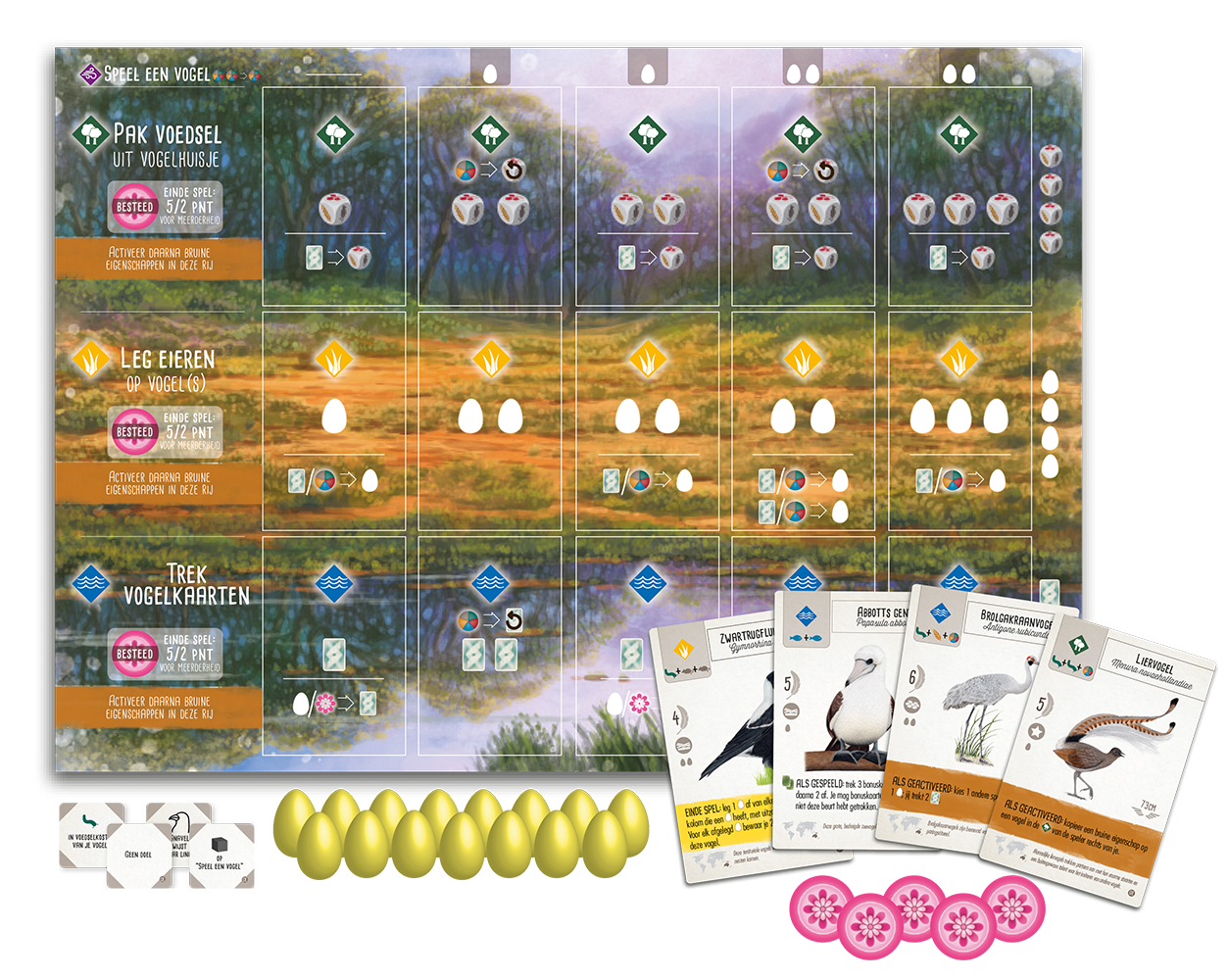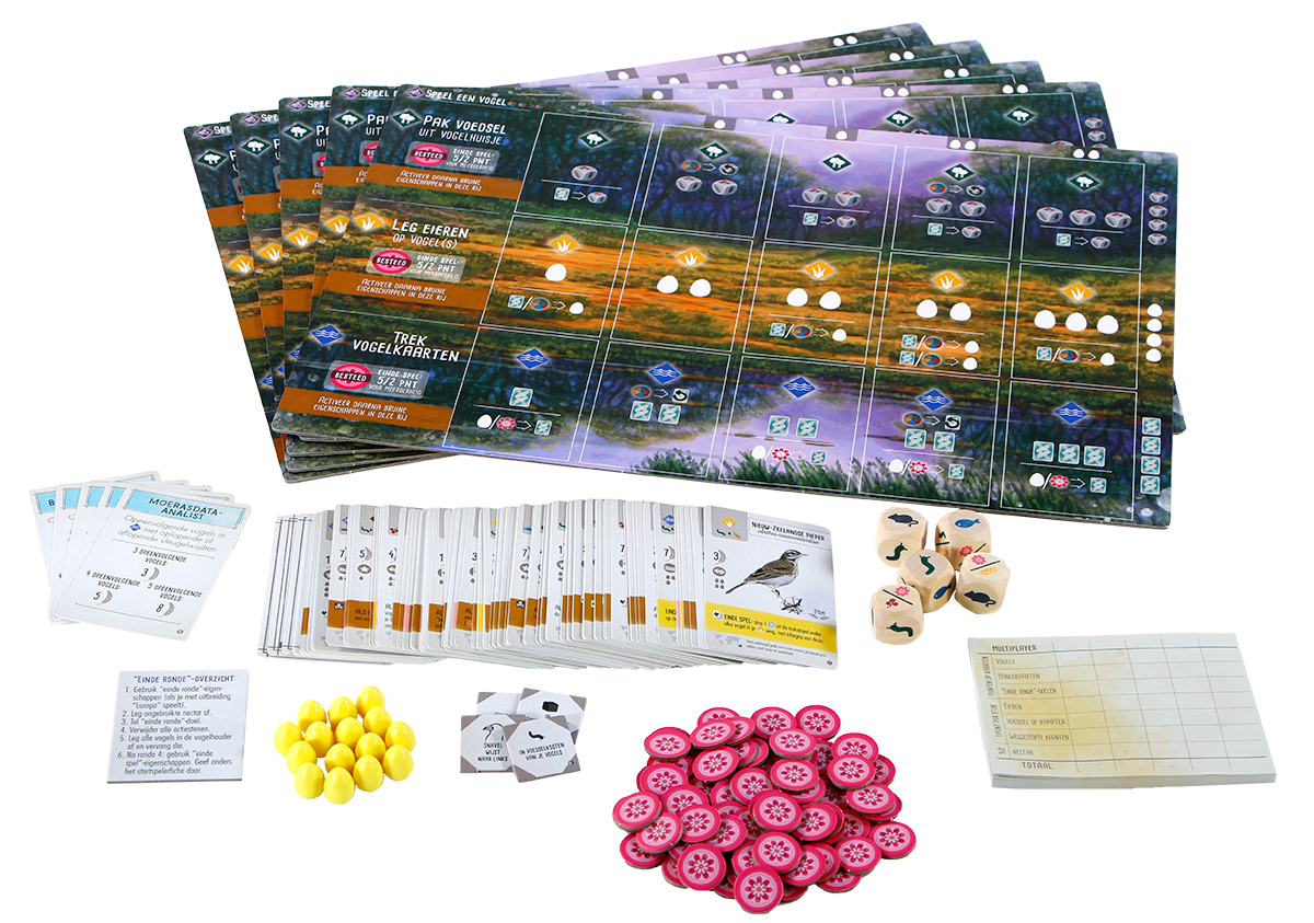 Als fanatieke vogelaar heb je inmiddels al de nodige ervaring opgedaan met de vele vogelsoorten in Wingspan. Met de Wingspan: Oceanië-uitbreiding gaat de tocht verder. Reis naar “Down Under” en ontdek 95 nieuwe vogelsoorten en hun leefgebieden van Australië, Nieuw-Zeeland en de vele eilanden in de buurt. Deze uitbreiding kent een nieuwe voedselsoort en een nieuwe kleur eieren, zodat je voor de nieuwkomers ook de juiste leefomstandigheden kunt creëren. Oceanië heeft een unieke biodiversiteit en overvloed aan plantaardige suikers. Om het ecosysteem op de juiste wijze te integreren, wordt in deze uitbreiding nectar als nieuwe voedselbron toegevoegd. Ook zitten er vogels bij die niet kunnen vliegen. Voor elke vogeleigenschap of bonuskaart die betrekking heeft op vleugelwijdte gelden deze vogels als jokers. En de nieuwe ‘gele’ vogelkaarten geven je een sterke actie die aan het eind van het spel wordt uitgevoerd. Deze uitbreiding bevat daarnaast nieuwe spelertableaus, bonuskaarten en meer “einde ronde” doelen. Zorg dat jij aan het einde van het spel de beste combinatie vogels hebt en sluit het spel “zo trots als een pauw” winnend af. *Om deze uitbreiding te kunnen spelen, is het basisspel vereist.