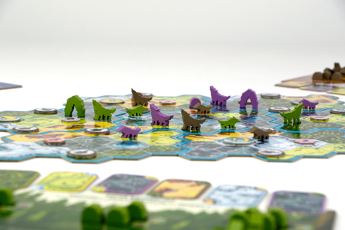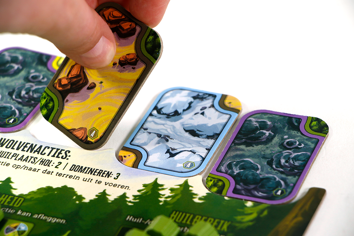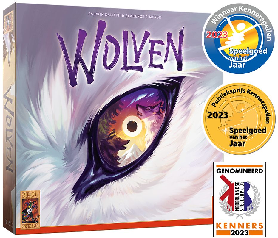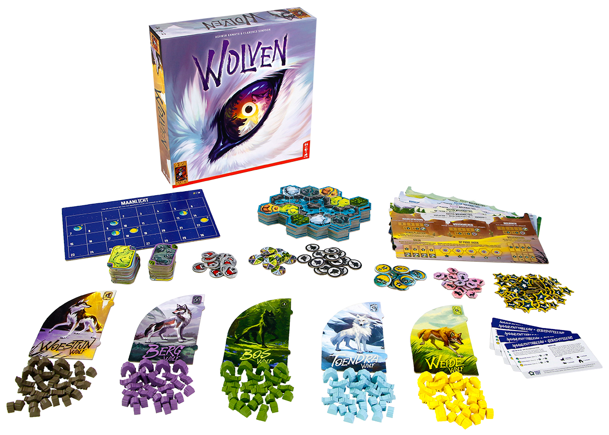 Ruig terrein, weinig mensen, veel wild. Een ideale omgeving voor wolven. Deze roedeldieren zoeken elkaar op om op prooi te jagen en zich voort te planten. Maar niet alle roedels gaan vreedzaam met elkaar om. Ze willen allemaal de macht over het gebied en daar hebben ze alles voor over. Wolven is een strategisch spel, waarin je een eigen roedel wolven leidt. Je probeert gebieden te claimen, je roedel uit te breiden, de eigenschappen van je roedel te ontwikkelen, holen te bouwen en op prooi te jagen. Al die dingen leveren op verschillende manieren voordelen en overwinningspunten op. Je beurten worden gestuurd door dubbelzijdige terreintegels. Elke beurt draai je er afhankelijk van de gekozen actie een aantal om. Je mag dan een actie op een veld van dat terrein uitvoeren, mits het binnen bereik van je wolven ligt. Zo kun je je wolven verplaatsen, schuilplaatsen bouwen, waardoor je de eigenschappen van je roedel verbetert, of je schuilplaatsen naar holen opwaarderen. Sommige acties kun je echter uitsluitend met je alfawolven uitvoeren en daar heb je er helaas niet zo veel van. De meeste punten scoor je door bepaalde gebieden te controleren op het moment dat de maan een bepaalde stand bereikt. Je hebt daarvoor de meeste speelstukken in zo’n gebied nodig. Omdat er per veld maar 2 speelstukken mogen staan, ontstaat er hevige concurrentie tussen de verschillende roedels van de spelers. Wolven is een zeer thematisch en uitdagend bordspel. De interactie tussen de roedels en het variabele speelveld zorgen er keer op keer voor dat je nieuwe strategieën en mogelijkheden moet verkennen om de winst naar je toe te trekken. Het prachtige artwork en de houten wolfjes zorgen voor een intense spelbeleving.
