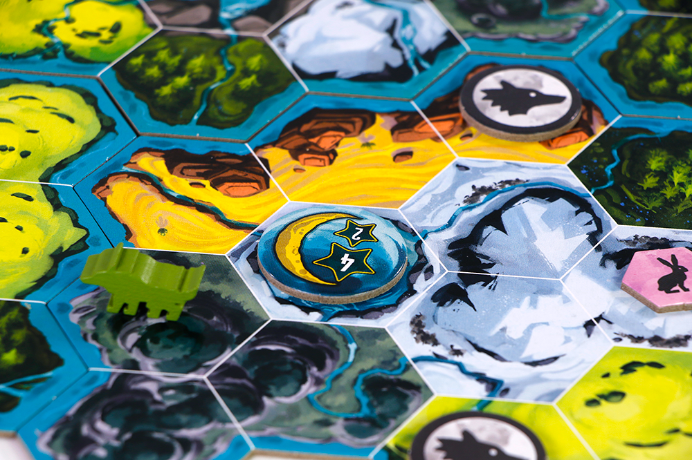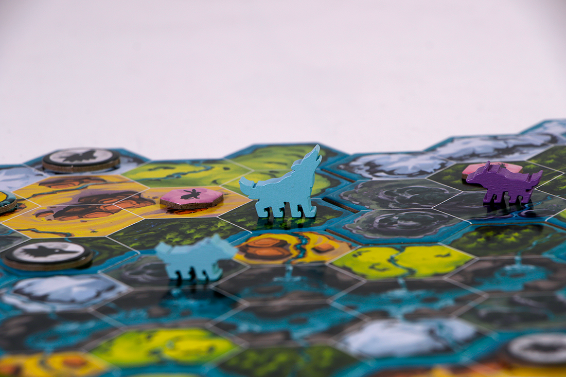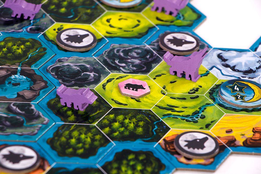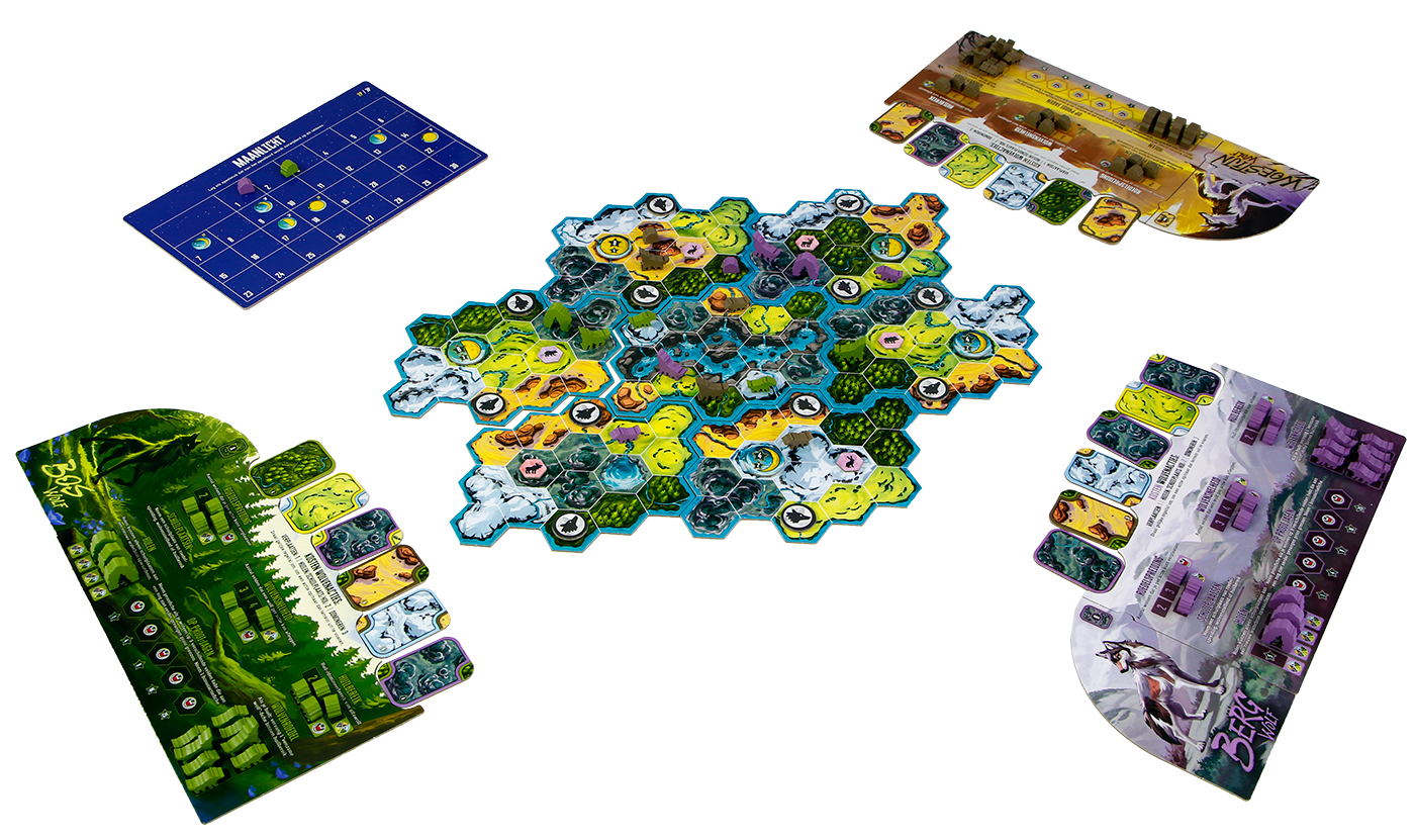 Ruig terrein, weinig mensen, veel wild. Een ideale omgeving voor wolven. Deze roedeldieren zoeken elkaar op om op prooi te jagen en zich voort te planten. Maar niet alle roedels gaan vreedzaam met elkaar om. Ze willen allemaal de macht over het gebied en daar hebben ze alles voor over. Wolven is een strategisch spel, waarin je een eigen roedel wolven leidt. Je probeert gebieden te claimen, je roedel uit te breiden, de eigenschappen van je roedel te ontwikkelen, holen te bouwen en op prooi te jagen. Al die dingen leveren op verschillende manieren voordelen en overwinningspunten op. Je beurten worden gestuurd door dubbelzijdige terreintegels. Elke beurt draai je er afhankelijk van de gekozen actie een aantal om. Je mag dan een actie op een veld van dat terrein uitvoeren, mits het binnen bereik van je wolven ligt. Zo kun je je wolven verplaatsen, schuilplaatsen bouwen, waardoor je de eigenschappen van je roedel verbetert, of je schuilplaatsen naar holen opwaarderen. Sommige acties kun je echter uitsluitend met je alfawolven uitvoeren en daar heb je er helaas niet zo veel van. De meeste punten scoor je door bepaalde gebieden te controleren op het moment dat de maan een bepaalde stand bereikt. Je hebt daarvoor de meeste speelstukken in zo’n gebied nodig. Omdat er per veld maar 2 speelstukken mogen staan, ontstaat er hevige concurrentie tussen de verschillende roedels van de spelers. Wolven is een zeer thematisch en uitdagend bordspel. De interactie tussen de roedels en het variabele speelveld zorgen er keer op keer voor dat je nieuwe strategieën en mogelijkheden moet verkennen om de winst naar je toe te trekken. Het prachtige artwork en de houten wolfjes zorgen voor een intense spelbeleving.